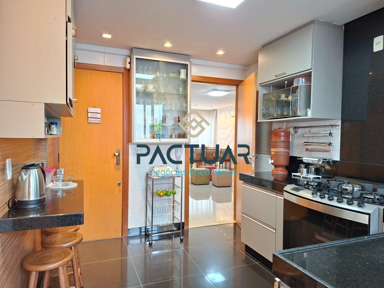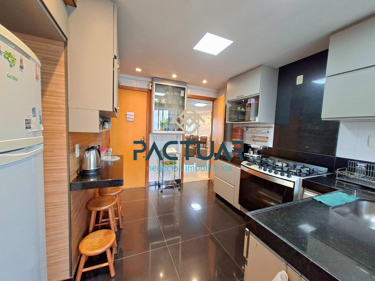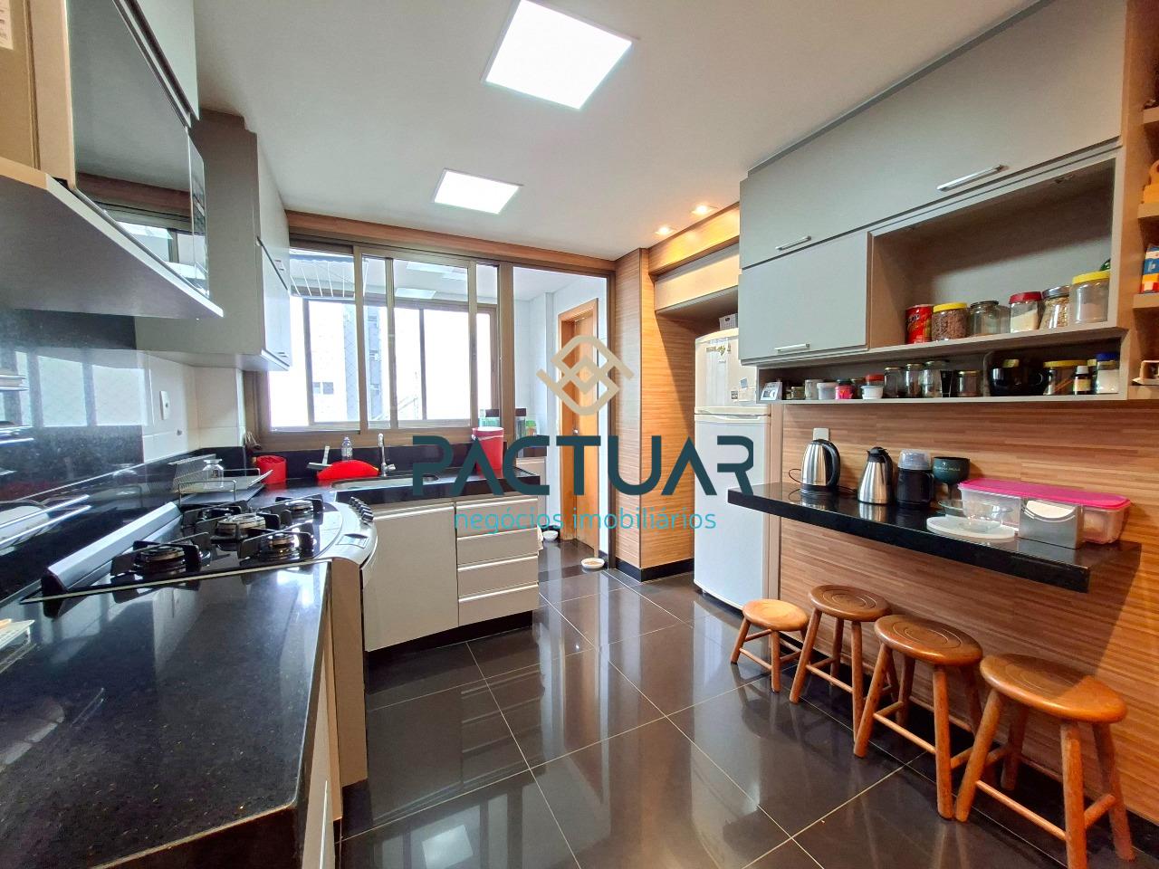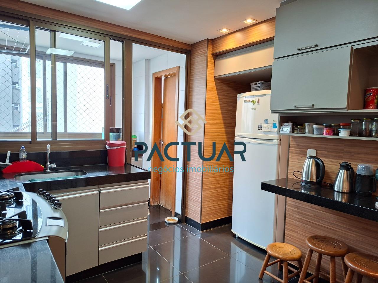 A cozinha é funcional e totalmente equipada, com armários planejados e bancada para lanche, além de área de serviço separada e banho de serviço. Os banheiros possuem armários, e os acabamentos valorizam o imóvel, com pisos em porcelanato e laminado, reforçando o design moderno e os ambientes bem planejados.