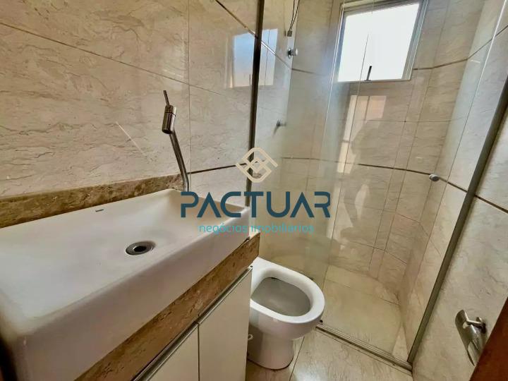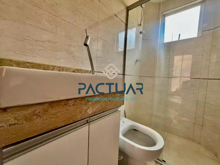O banho social possui bancada em granito, armário, espelho e box em blindex, oferecendo funcionalidade e acabamento de qualidade.